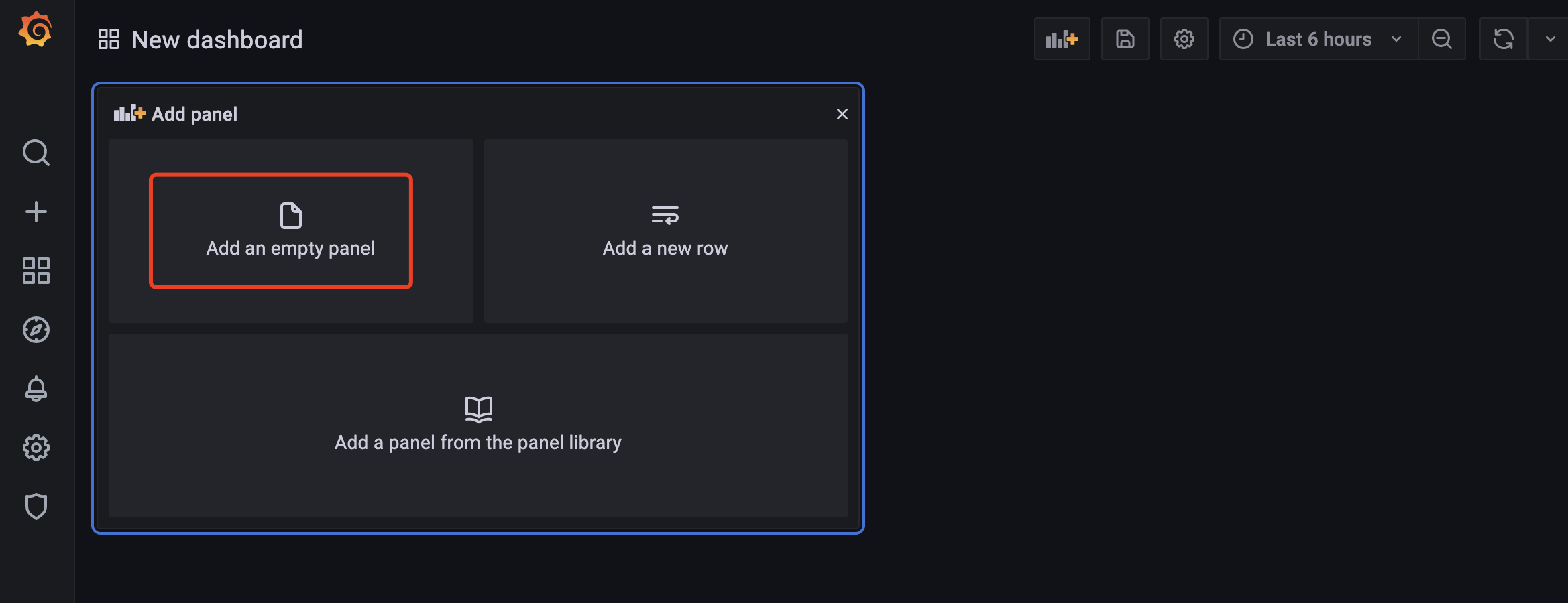 Click the New Dashboard icon on the top right, and select Add an empty panel option.