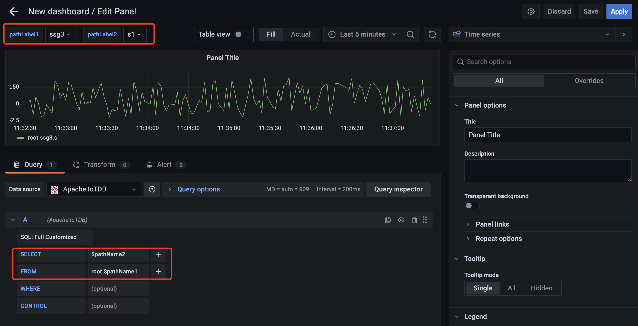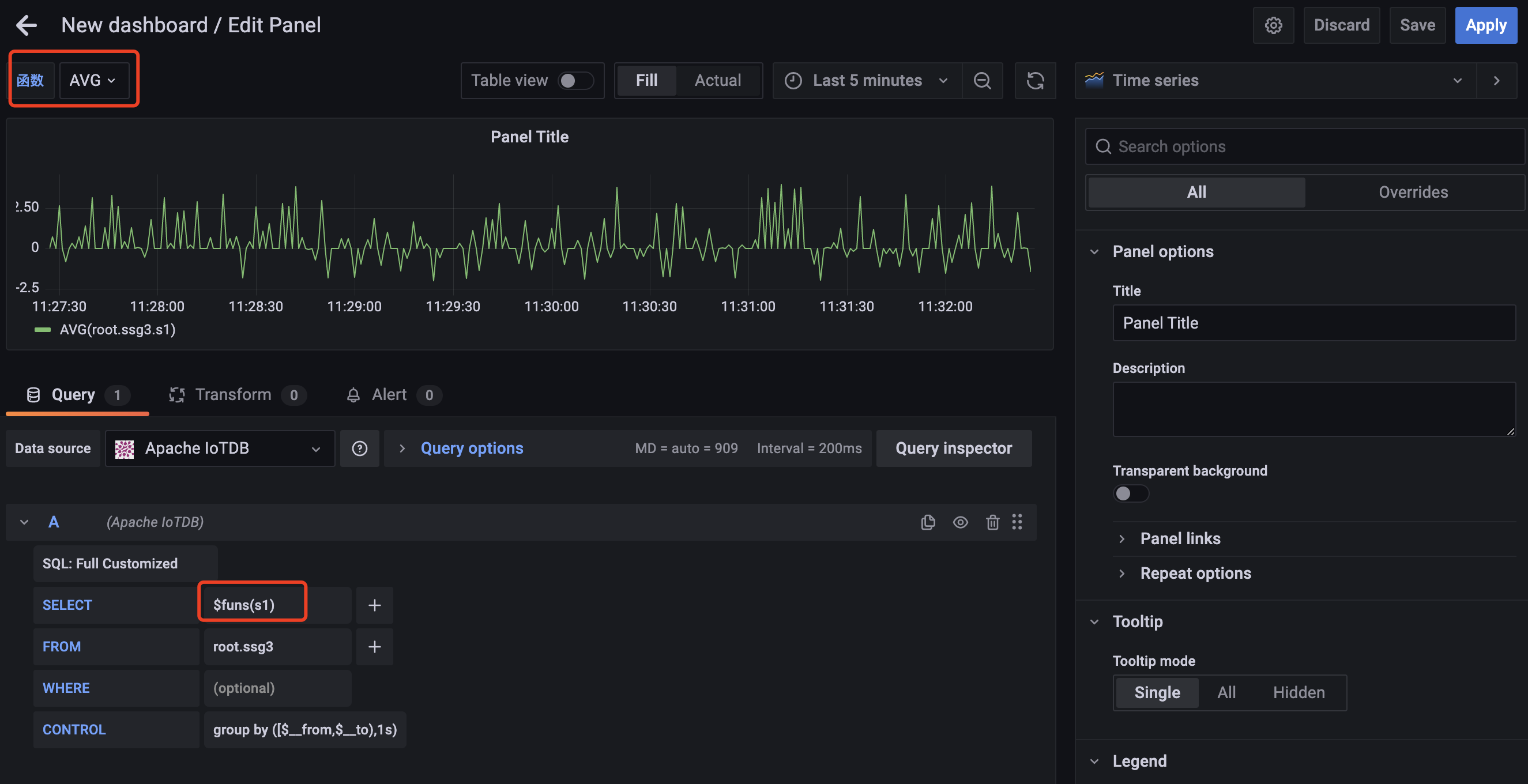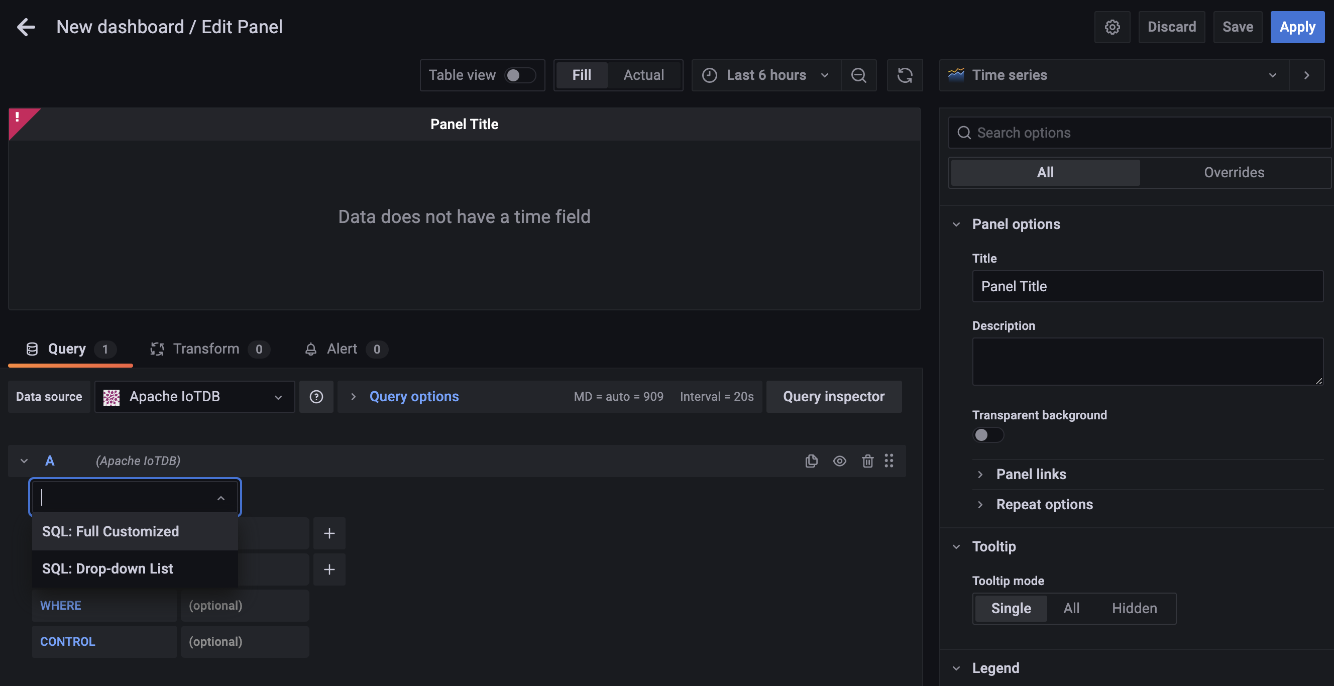 Grafana plugin supports SQL: Full Customized mode and SQL: Drop-down List mode, and the default mode is SQL: Full Customized mode.