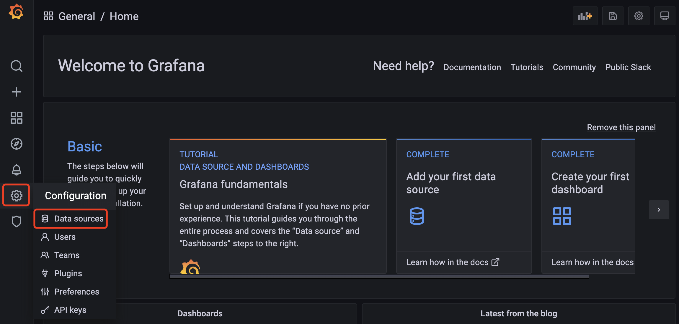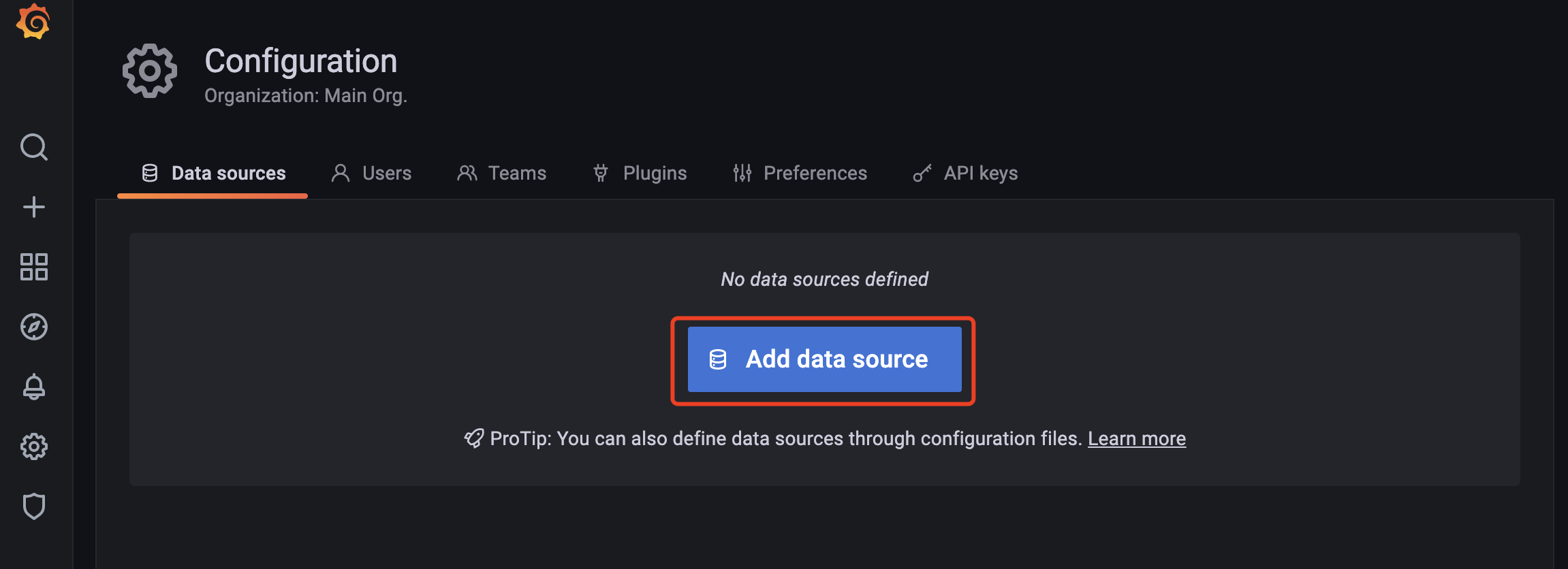 Click the Settings icon on the left, select the Data Source option, and then click Add data source.
