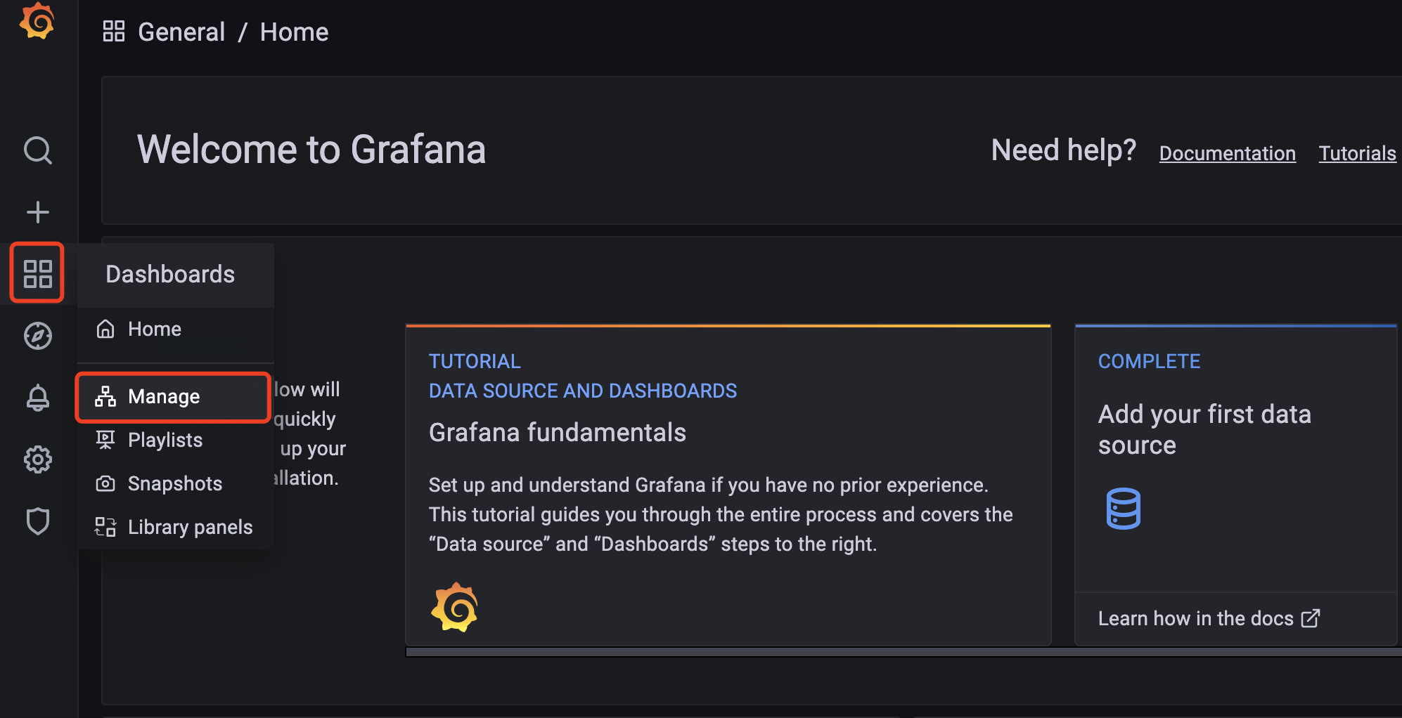 Click the Dashboards icon on the left, and select Manage option.