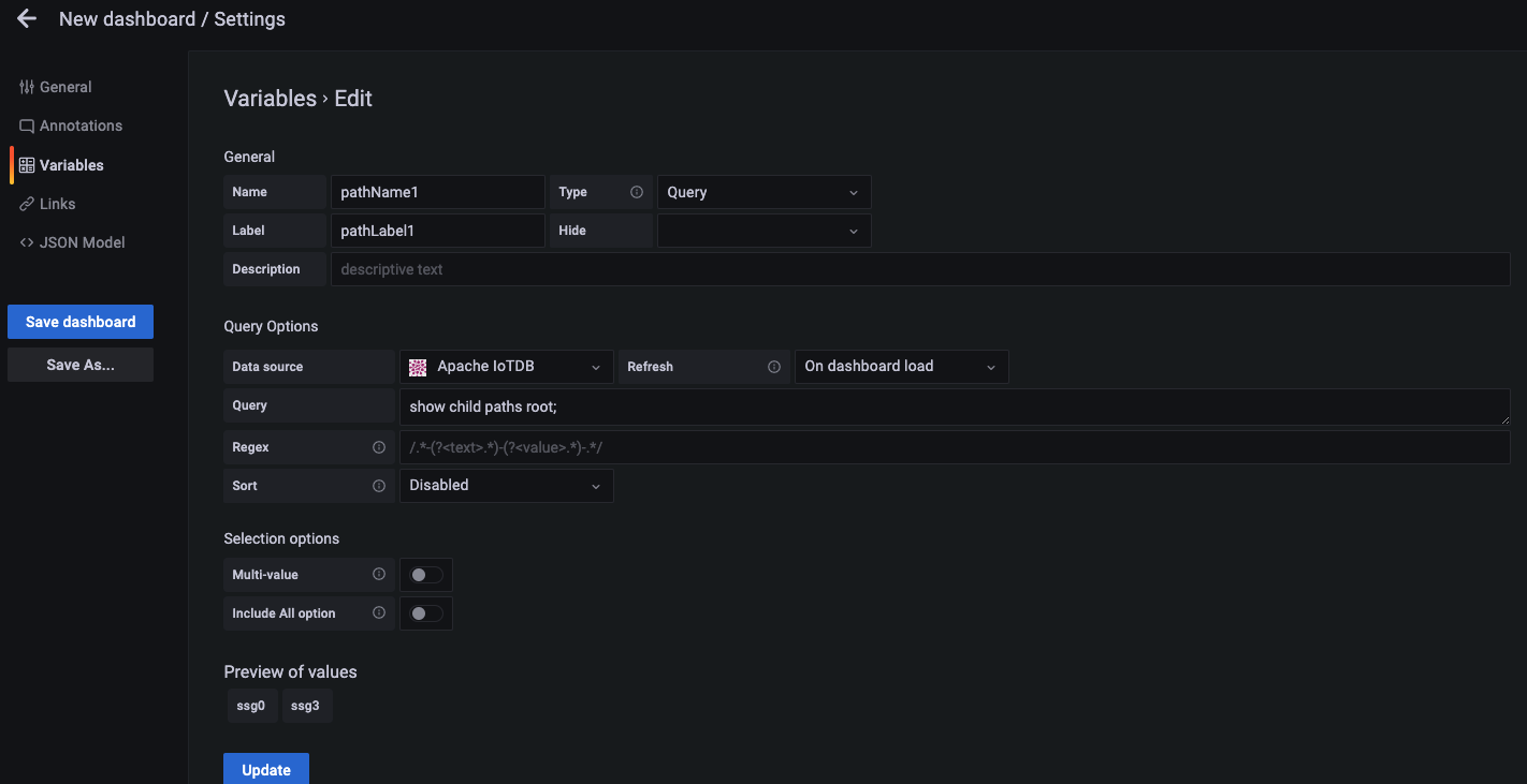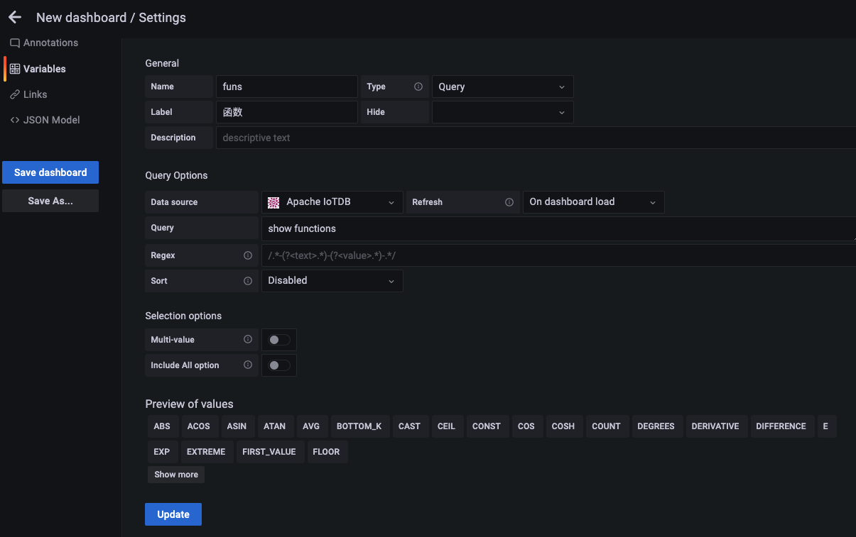 There are Query, Custom, Text box, Constant, DataSource, Interval, Ad hoc filters, etc. in the Type drop-down, all of which can be used in IoTDB's Grafana Plugin