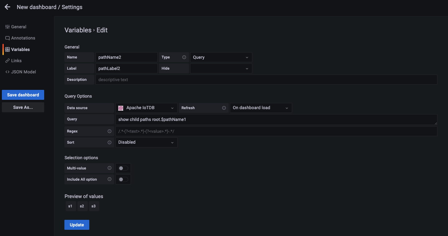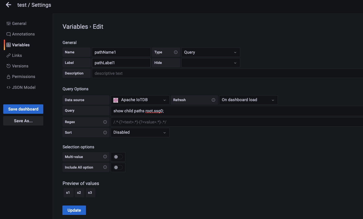 For a more detailed introduction to usage, please check the official manual (https://grafana.com/docs/grafana/latest/variables/)