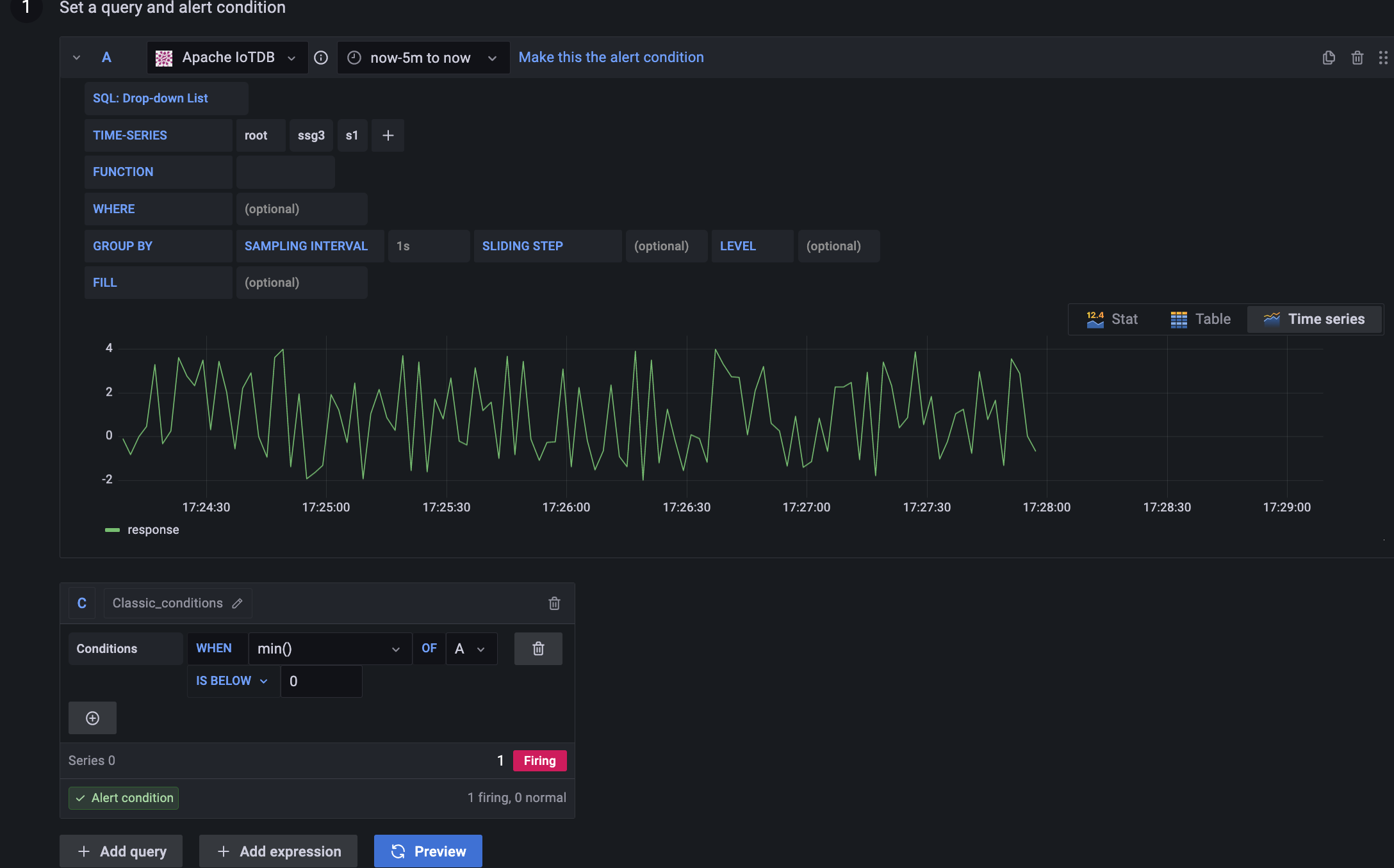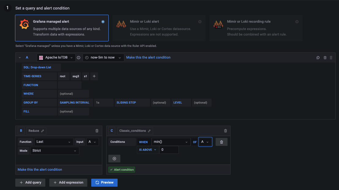 The query condition in the figure: min() OF A IS BELOW 0, means that the condition will be triggered when the minimum value in the A tab is 0, click this function to change it to another function.