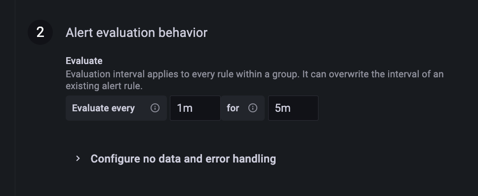 Evaluate every, specify the evaluation frequency. Must be a multiple of 10 seconds. For example, 1m, 30s.