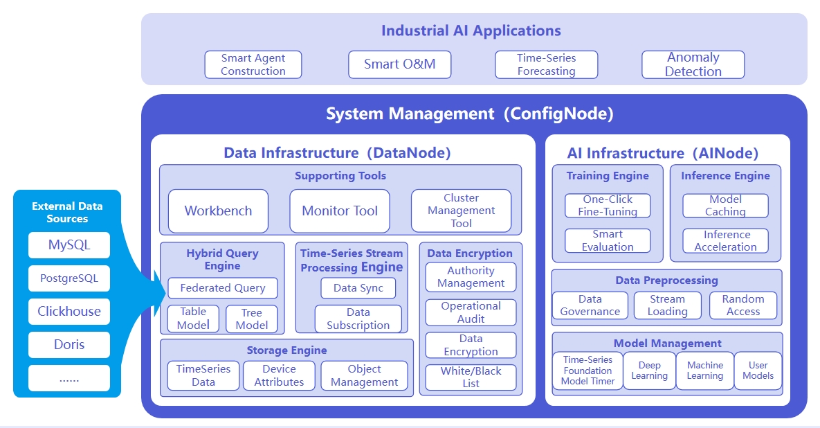 AINode is a native IoTDB node that supports the registration, management, and invocation of time series related models. It includes industry-leading self-developed time series large models, such as the Timer series models developed by Tsinghua University. Models can be invoked using standard SQL statements, enabling millisecond-level real-time inference on time series data, and supporting application scenarios such as time series trend prediction, missing value filling, and anomaly value detection.
