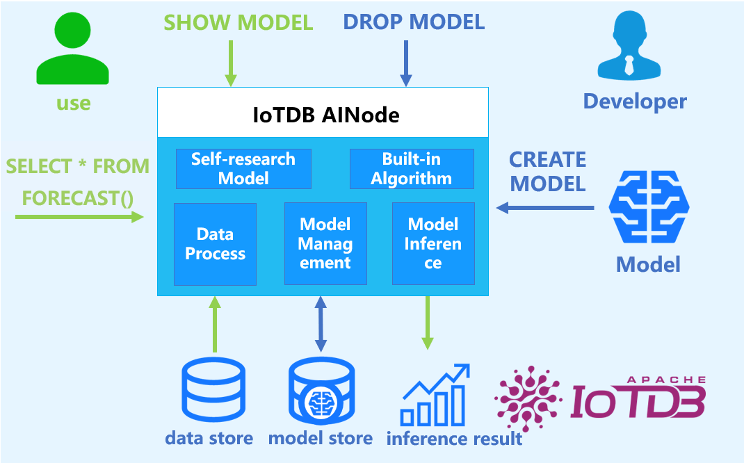 - Create (Create): Load the external designed or trained model file or algorithm into AINode, managed and used uniformly by IoTDB.