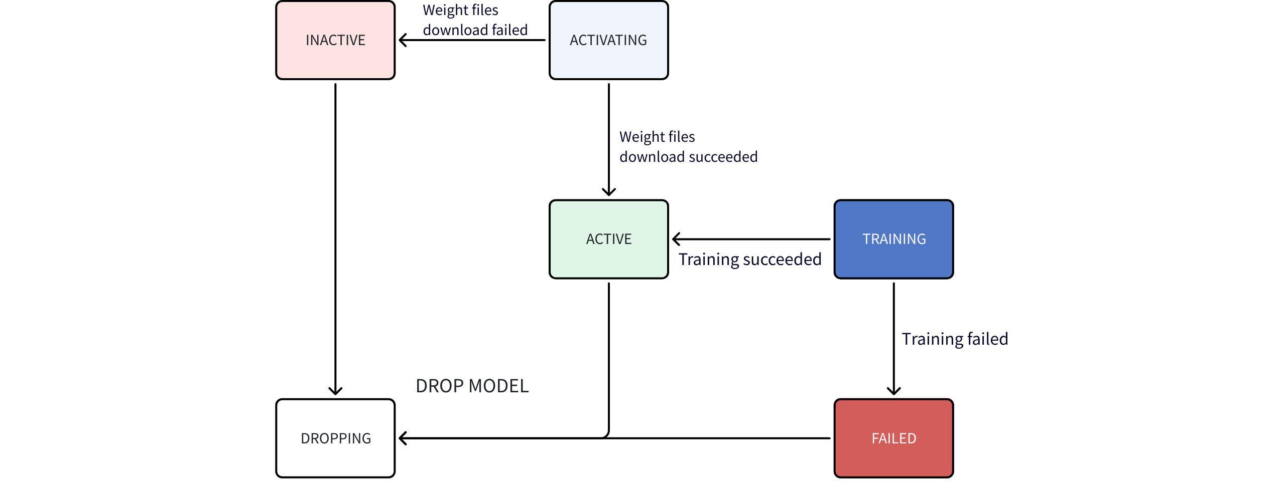 - After users start a model fine-tuning task, the model state during training is TRAINING, and after successful training, it becomes ACTIVE, and if failed, it becomes FAILED.