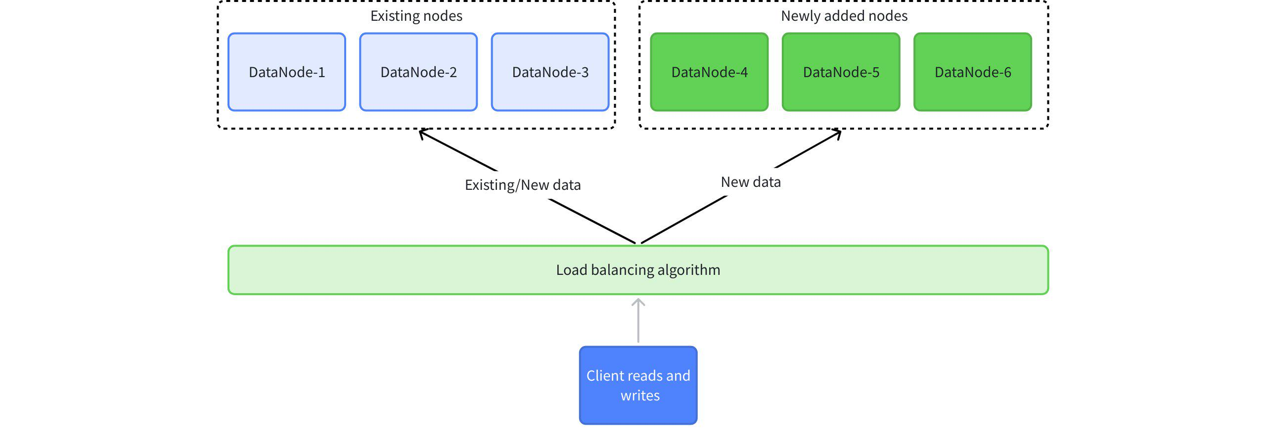 After scaling, the load balancing rule for client read/write requests is that existing nodes may handle data reads and writes for both old data (data belonging to DeviceIds already existing in the cluster) and new data (data belonging to DeviceIds not previously existing in the cluster), while newly added nodes will only receive requests for the new data. The existing nodes do not automatically rebalance the original replica groups. Data load balancing typically occurs when a new time partition is created, scheduled by default for 8 AM every Thursday. Its core principle involves the load balancing algorithm operating on series partition slots and time partition slots to determine which node's partition handles the data.