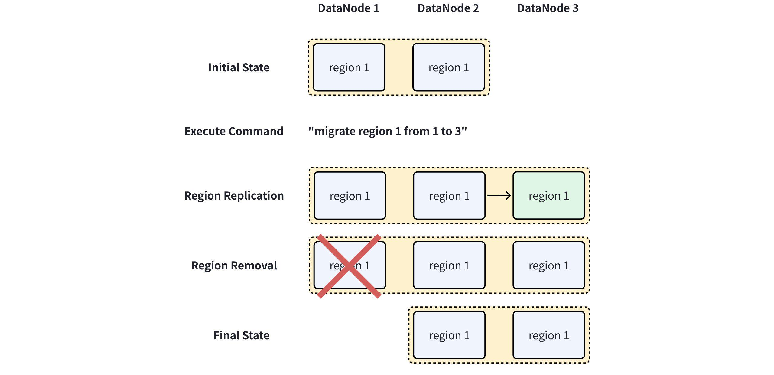 In the cluster composed of 3 DataNodes shown above, the region 1 replica group is distributed across DataNode 1 and DataNode 2. Assuming you want to migrate the region 1 replica from DataNode 1 to DataNode 3, the operation flow is as follows: