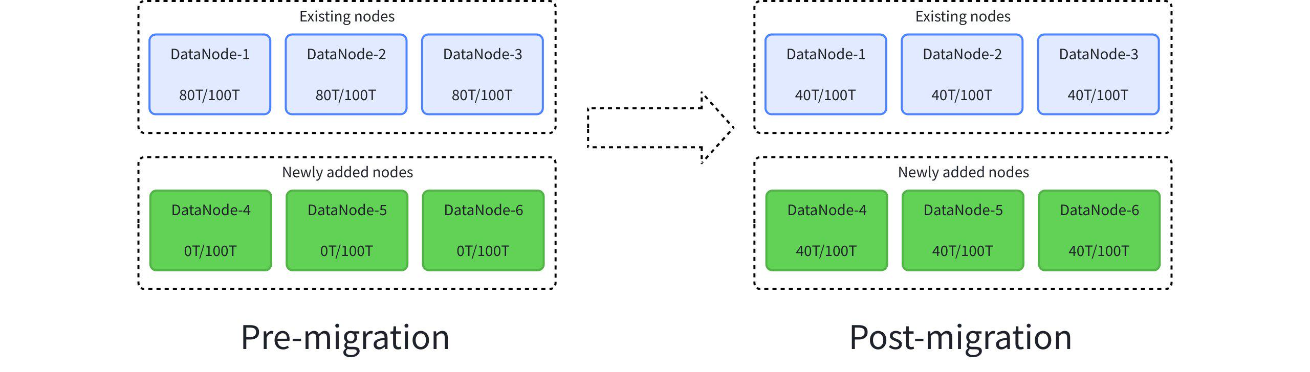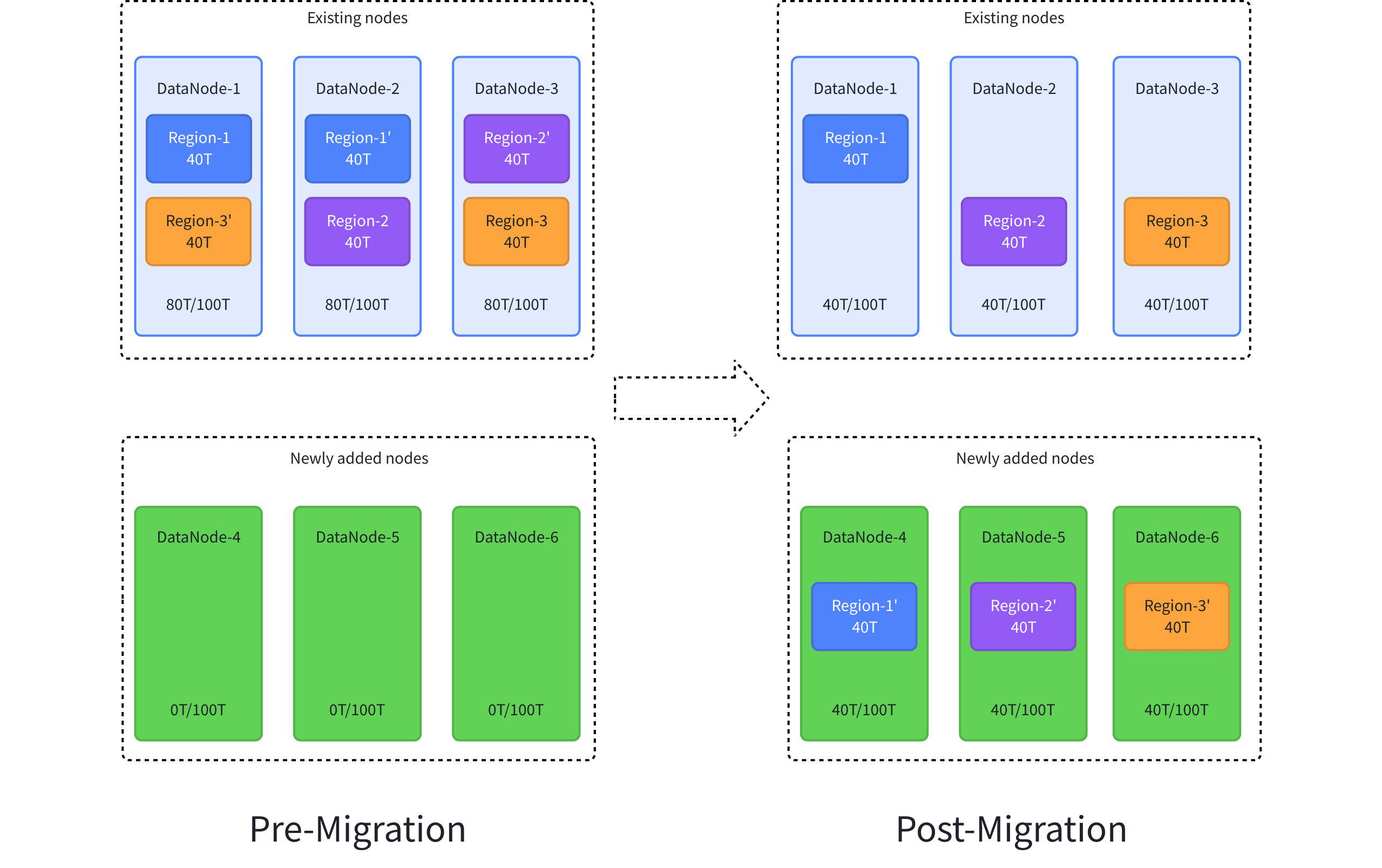 By default, historical data is not automatically migrated after scaling. If you need to balance the data distribution across nodes, you must manually migrate Regions. The estimated migration time is: Region data volume ÷ actual data transfer rate. As shown in the figure below, assuming 80TB of data load from existing nodes needs to be balanced to newly added nodes, if the data volume of a single Region is 1 TB and the transfer speed is 100 MB/s, the migration will take approximately 3 hours.