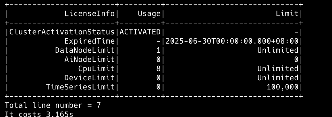 IoTDB> activate '01-D4EYQGPZ-EAUJJODW-NUKRDR6F-TUQS3B75-EDZFLK3A-6BOKJFFZ-ALDHOMN7-NB2E4BHI-7ZKGFVK6-GCIFXA4T-UG3XJTTD-SHJV6F2P-Q27B4OMJ-R47ZDIM3-UUASUXG2-OQXGVZCO-MMYKICZU-TWFQYYAO-ZOAGOKJA-NYHQTA5U-EWAR4EP5-MRC6R2CI-PKUTKRCT-7UDGRH3F-7BYV4P5D-6KKIA==='2.7 Verify Activation