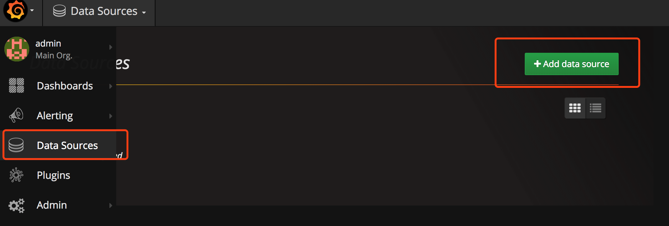 点击左上角的“Grafana”图标,选择Data Source选项,然后再点击Add data source。
