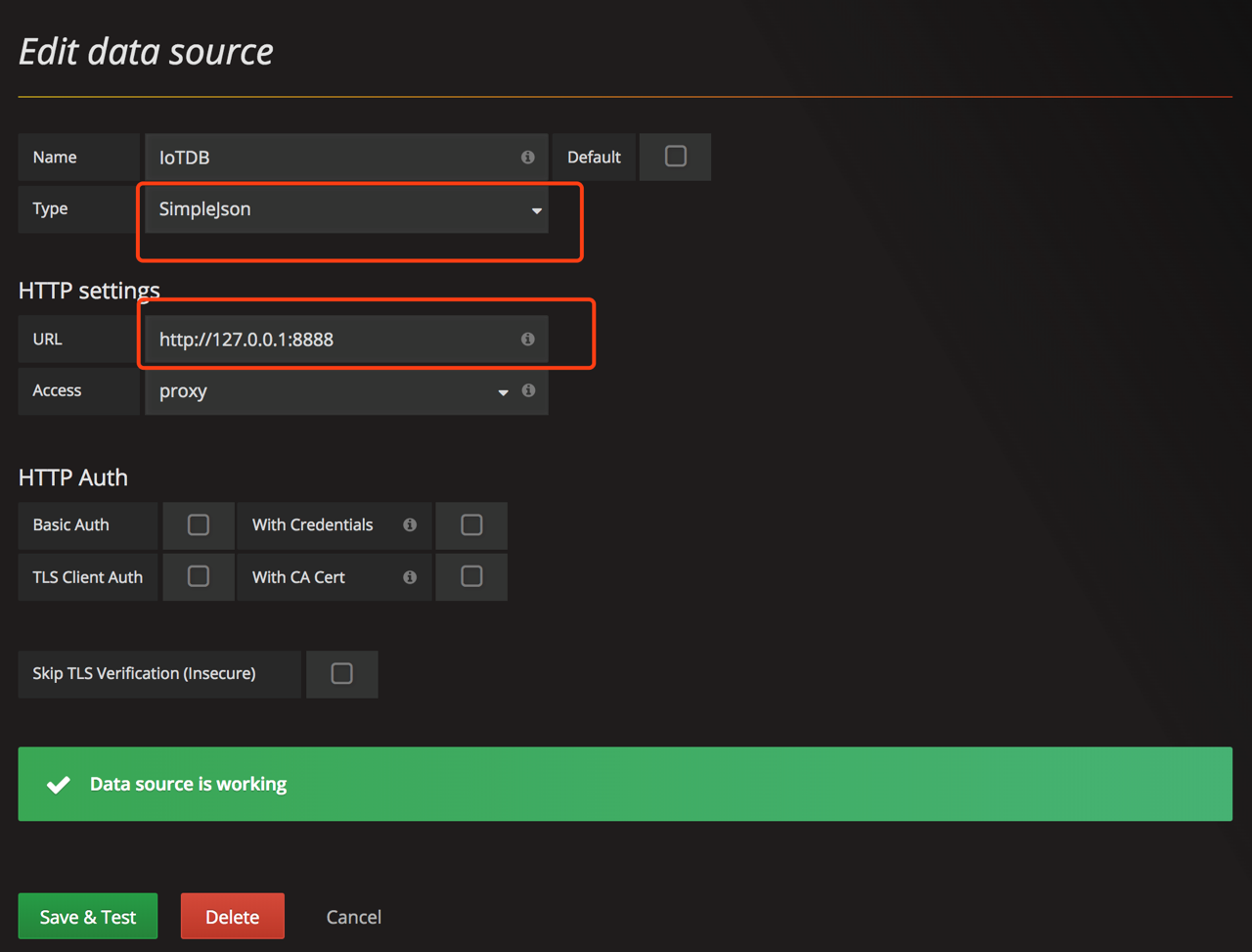 在编辑数据源的时候,Type一栏选择Simplejson,URL一栏填写 http://<ip>:<port>,IP 为您的 IoTDB-Grafana-Connector 连接器所在的服务器 IP,Port 为运行端口(默认 8888)。之后确保 IoTDB 已经启动,点击“Save & Test”,出现“Data Source is working”提示表示配置成功。